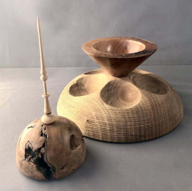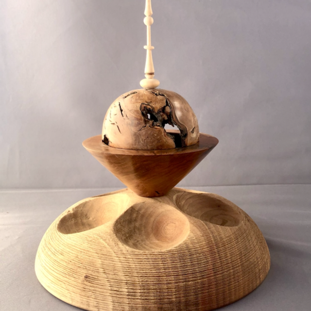 Portagioie in noce spazzolato con 5 concavi in fisassato, box centrale in ciliegio con coperchio in radica di melo e puntale in acero