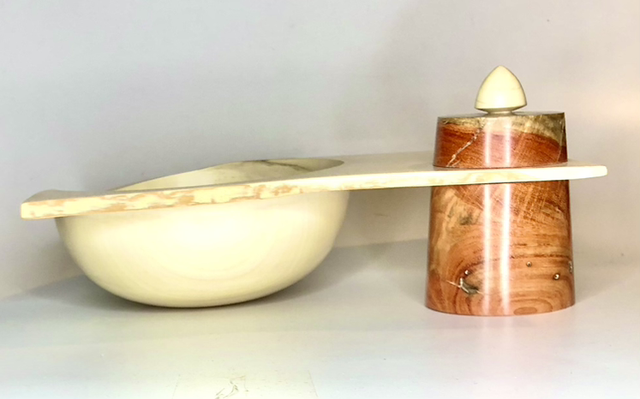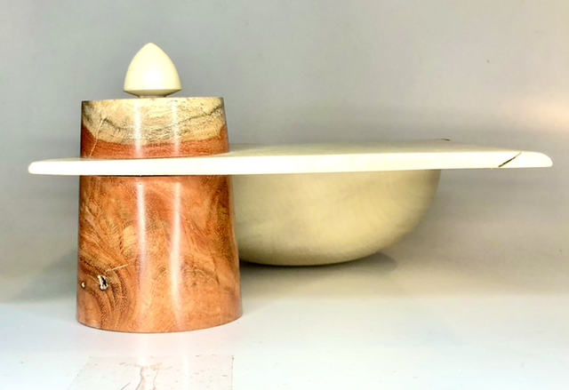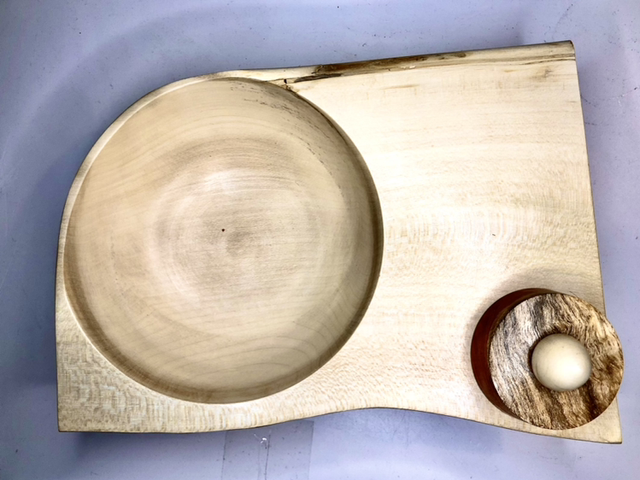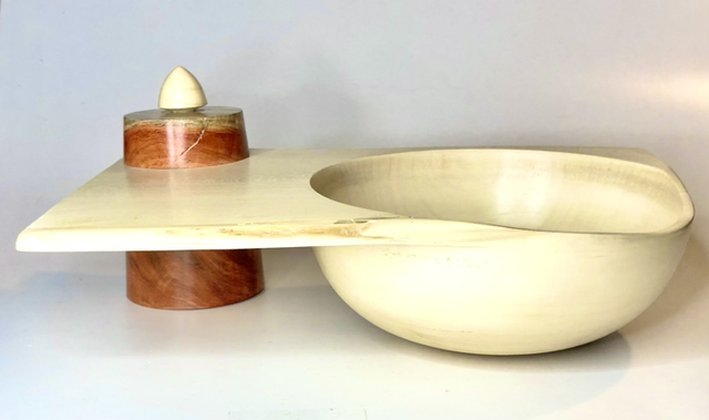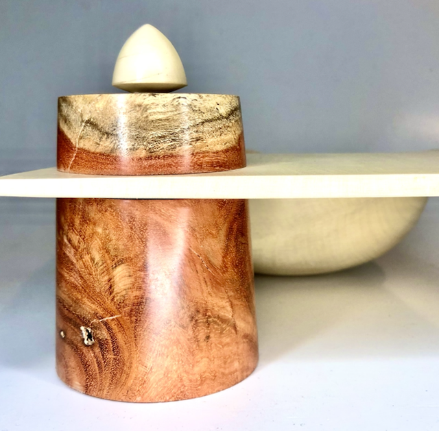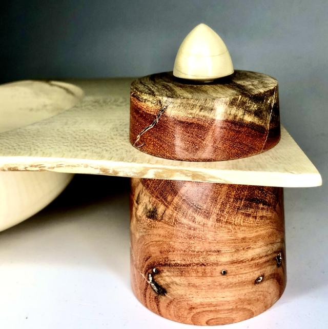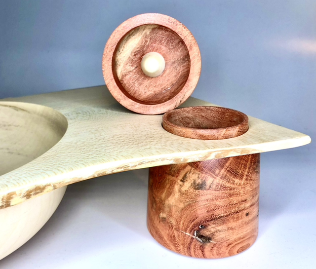 Tornitura artistica, svuota tasche in agrifoglio con scatola incorporata in carrubo.